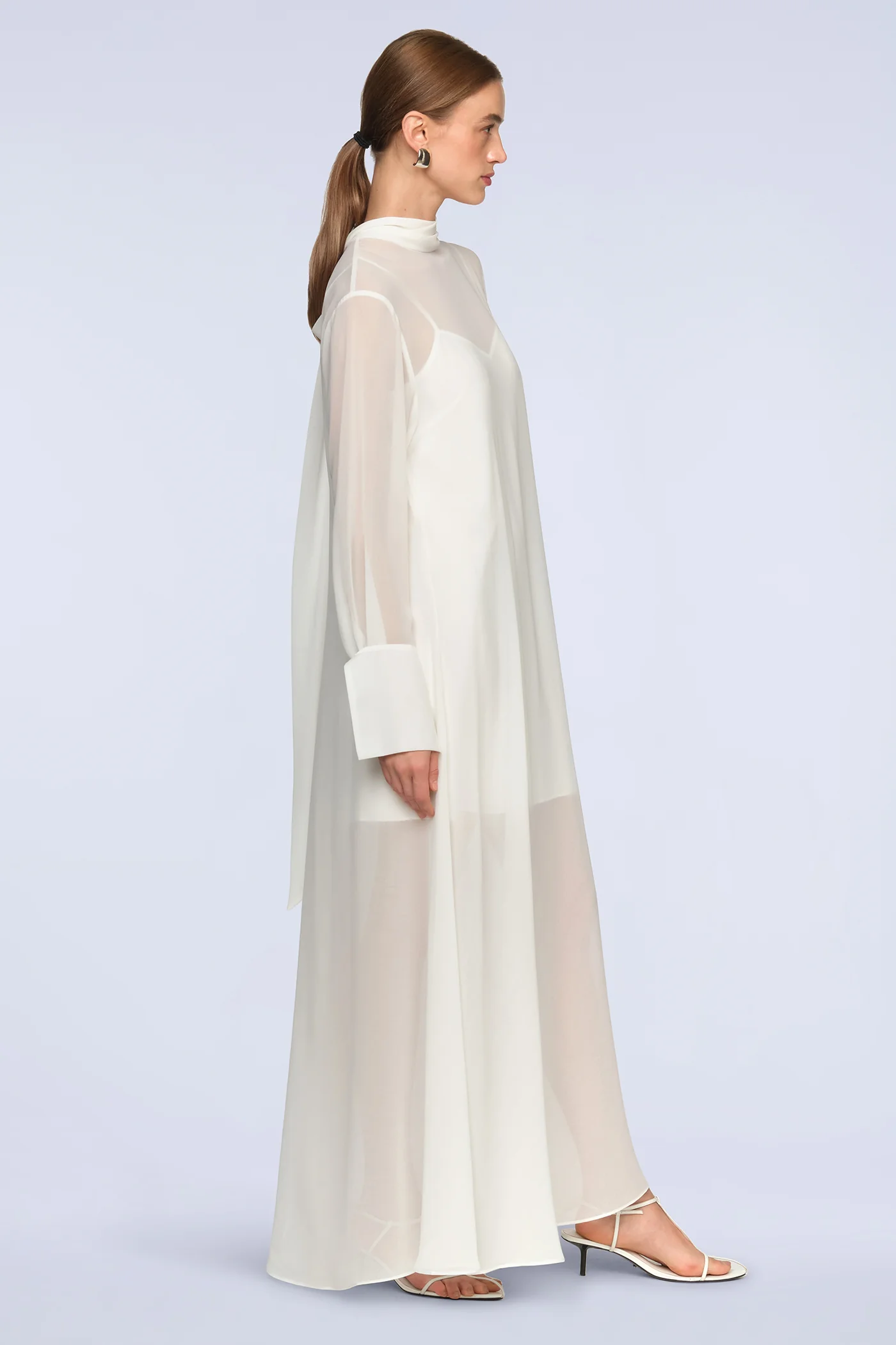 Sheer ivory chiffon gown crafted with a fluid, weightless drape. Designed with soft translucence and elongated back ties that move with her. A refined statement for galas and low-lit interiors.