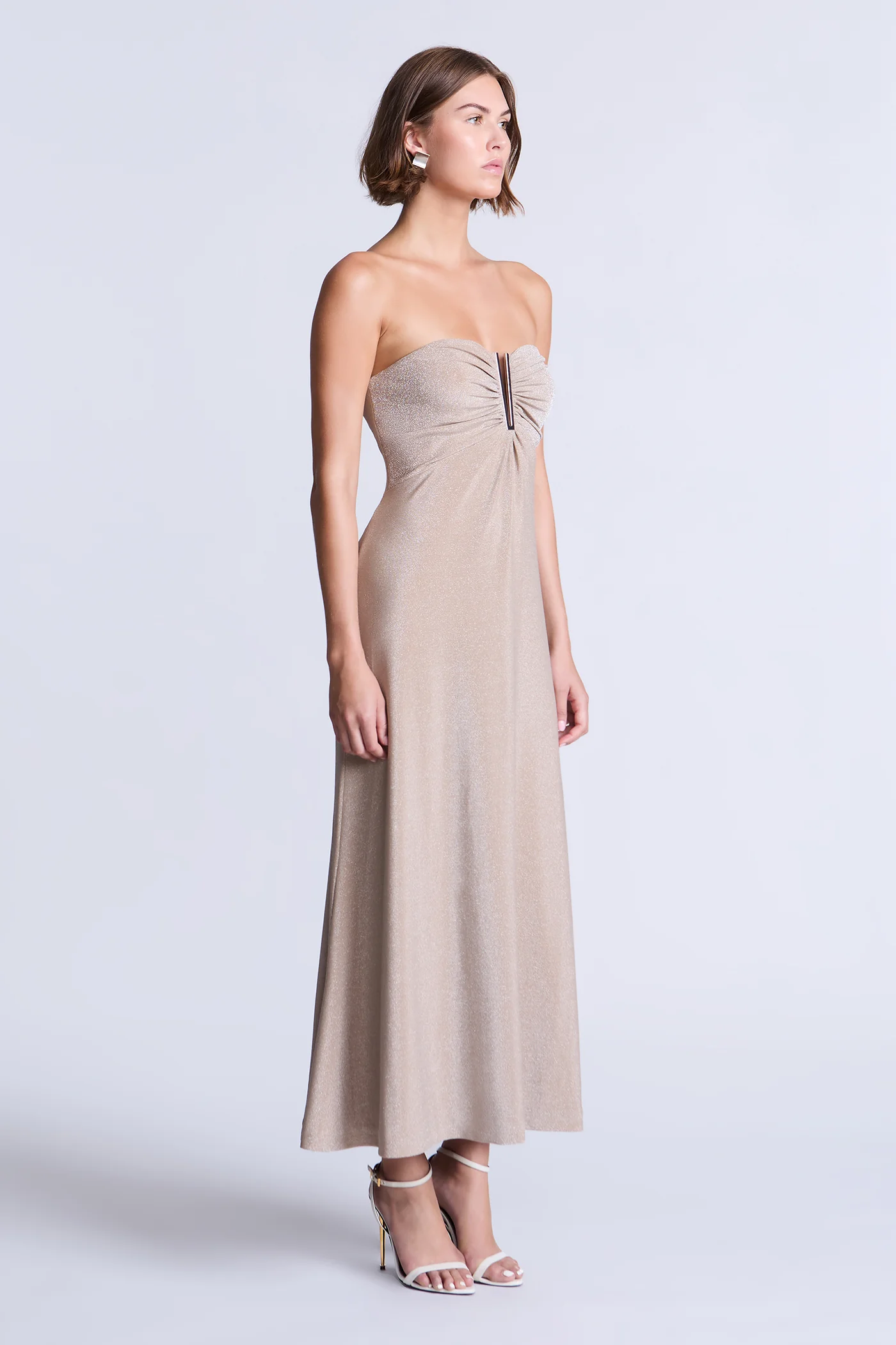 Champagne metallic-knit dress featuring an ankle-length silhouette with an airy, fluid flare. Designed with a gathered strapless bodice anchored by a V-shaped hardware inset. An essential for gallery receptions and architectural courtyards.